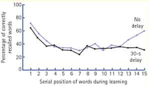 Murdock suggested that words early in the list were put into long-term memory (primacy effect) because the person has time to rehearse each word acoustically. Words from the end of the list went into short-term memory (recency effect) which can typically hold about 7 items. Words in the middle of the list had been there too long to be held in short-term memory and not long enough to be put into long-term memory. However, Glanzer and Cunitz showed that the words at the end of the list are only remembered if recalled first and tested immediately. Delaying recall by 30 seconds prevented the recency effect.